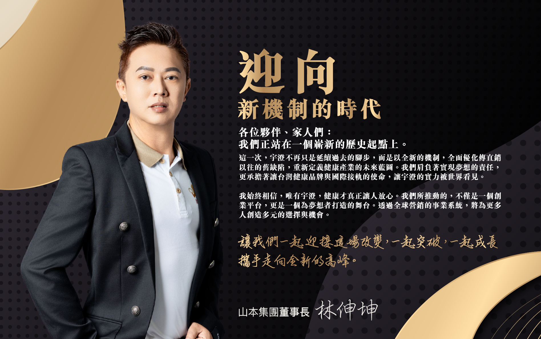 我們現在站在一個新的歷史起點上,肩負著實現夢想的重任,促進健康產業與國際接軌,讓宇澄健康產業的實力被世界看見 ,唯有宇澄,健康才放心,我相信,全球多層次聯網事業一定會為大家帶來提供更多元的創業機會。